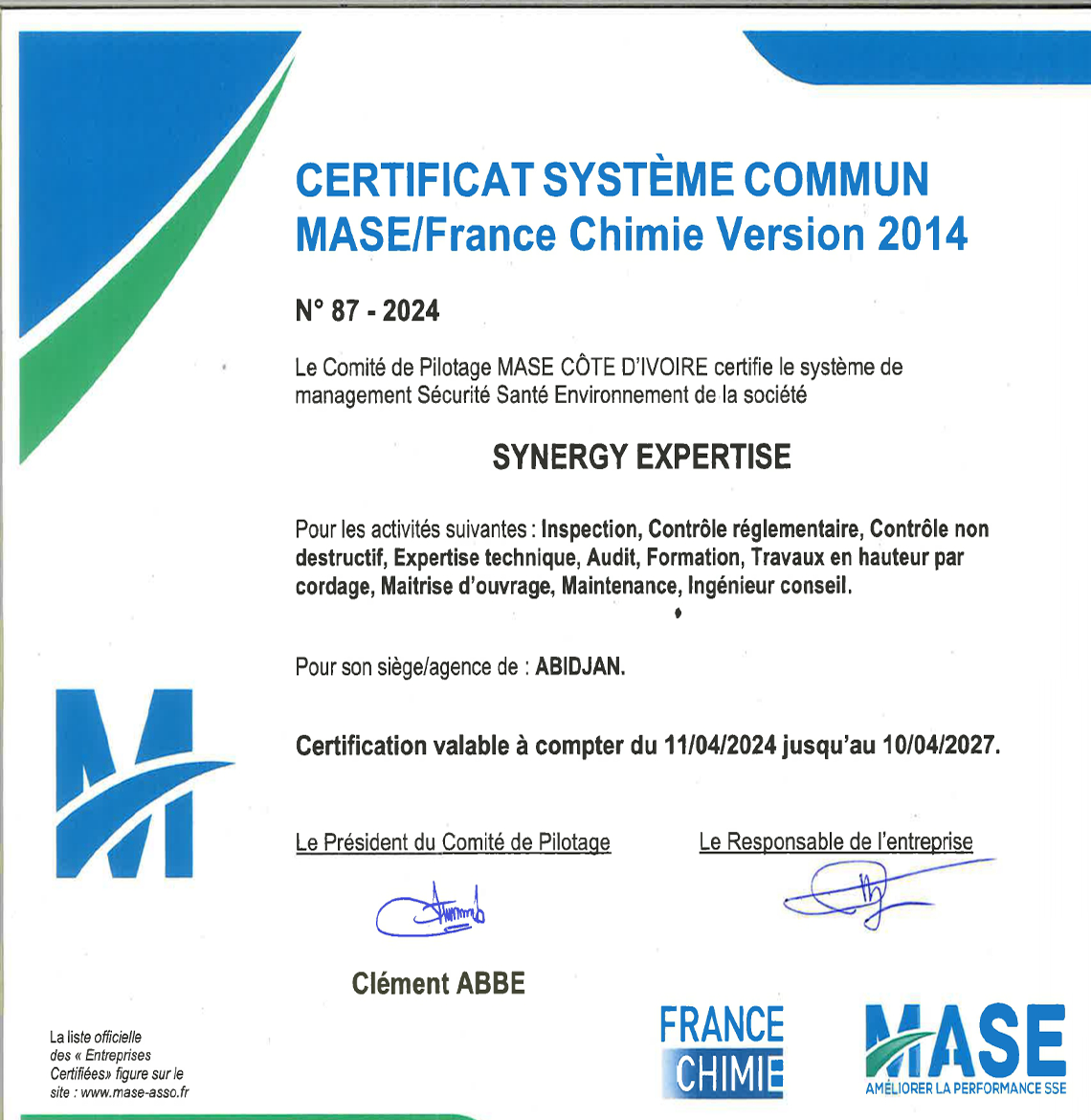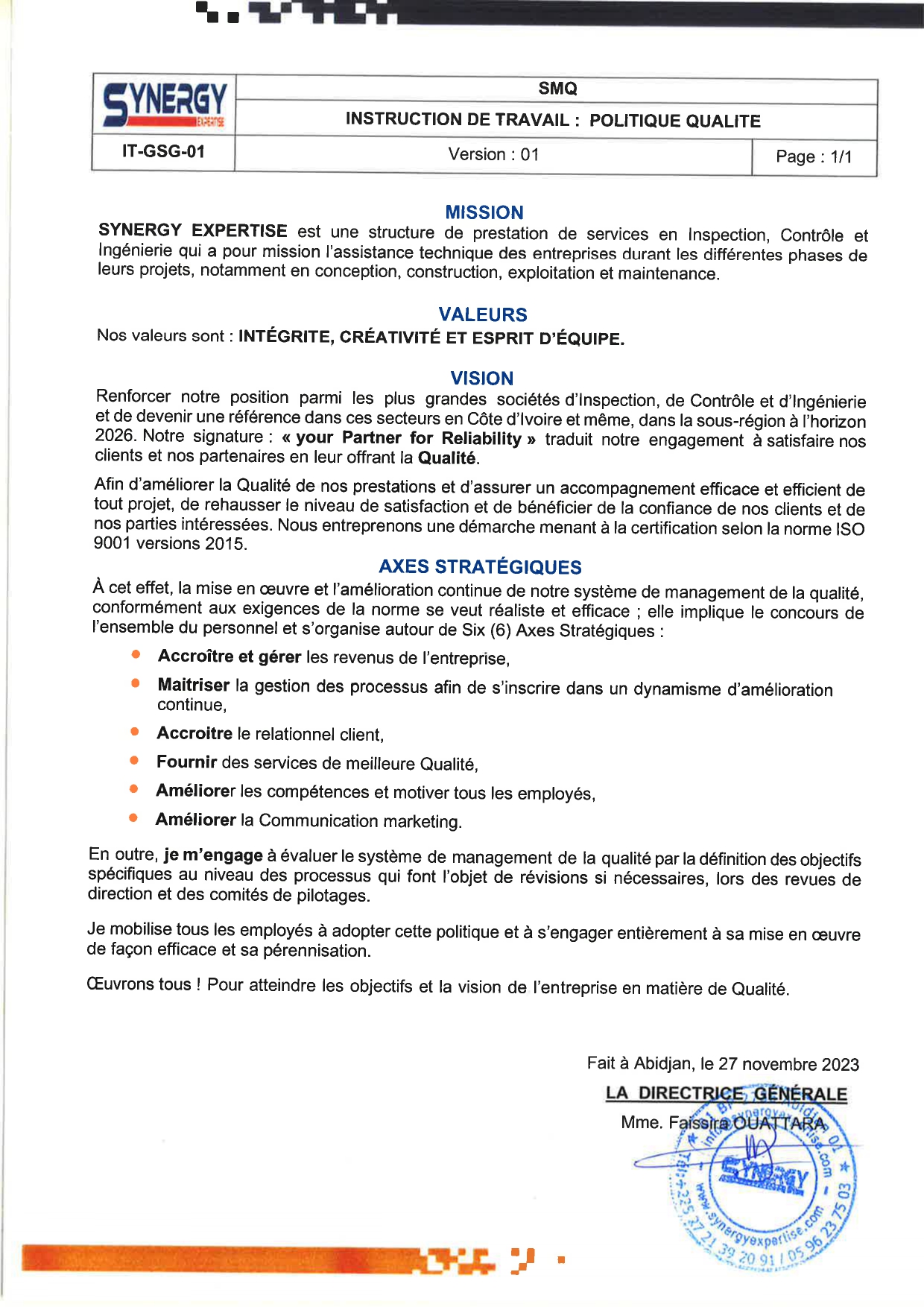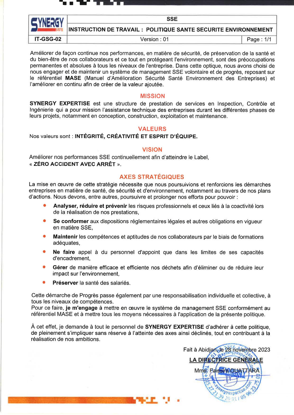Soucieux de la conformité de ses services aux exigences règlementaires, et désireuse de garantir des relations mutuellement bénéfiques avec ses partenaires, SYNERGY EXPERTISE s'engage à démontrer ses responsabilités à travers ses politiques Qualité et SSE.
